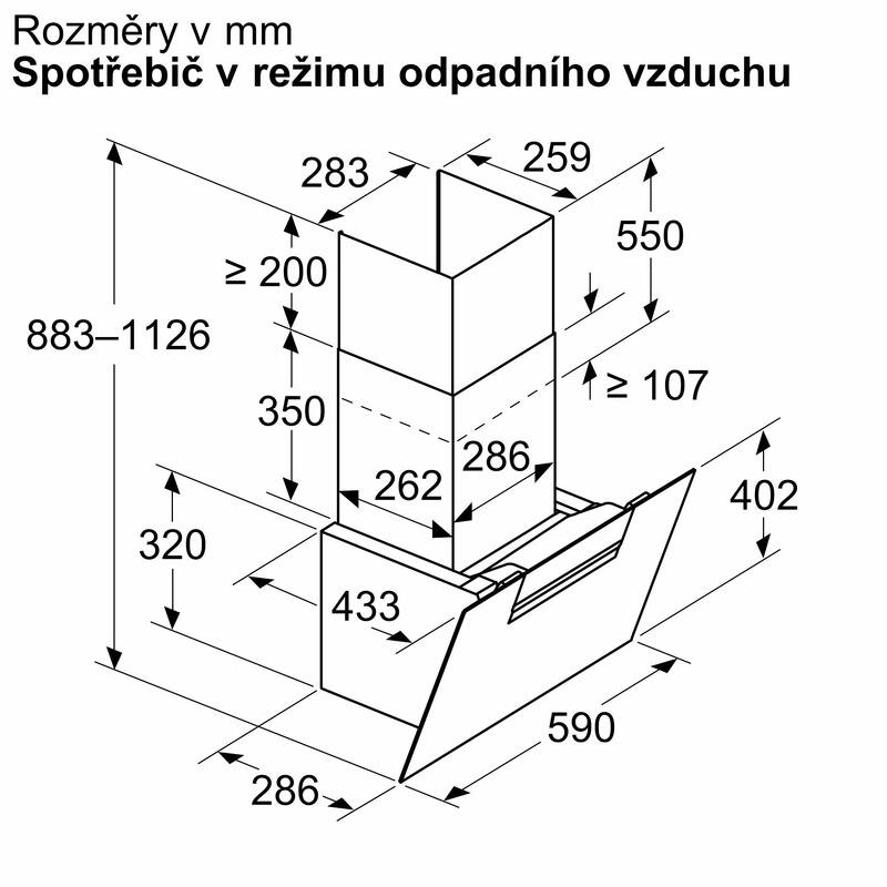 rozměry spotřebiče pro odvětrávání (V x Š x H): 883-1126 x 590 x 433 mm