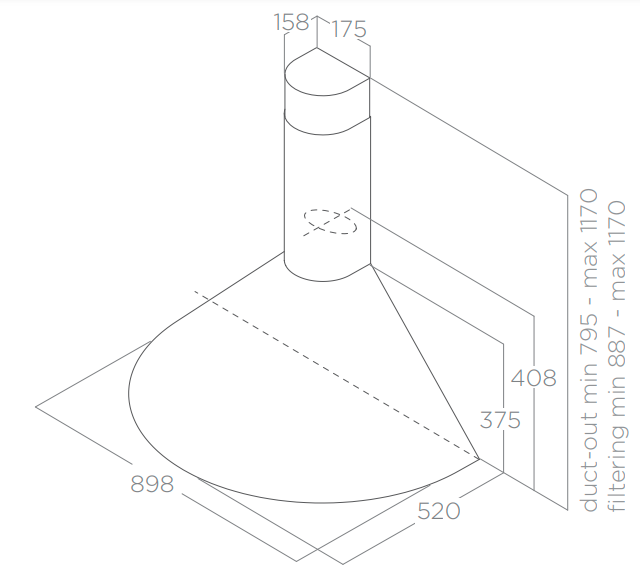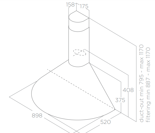 ELICA  TONDA je komínový odsavač par (digestoř) je vyroben z nerezové oceli. Odsavač par (digestoř) nabízí velký výkon od 265-355 m3/h a nízkou hlučností 60-67 db(A).