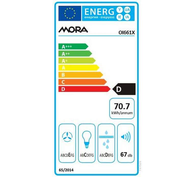 Vestavný odsavač par Mora OI 661 X ve stříbrném provedení je zařazen do energetické třídy D. Maximální výkon odsávání dosahuje 370 m³/hod. Odsavač je vhodný pro montáž s odtahem do komína, nebo s provozem recirkulace. Horní odtah má průměr 120 mm. Vybrat a nastavit si můžete ze 3 rychlostí výkonu pomocí knoflíku, který je umístěn naboku. Maximální hlučnost dosahuje 67 dB. Pracovní plocha pod odsavačem je osvětlena LED osvětlením s výkonem 6 W.