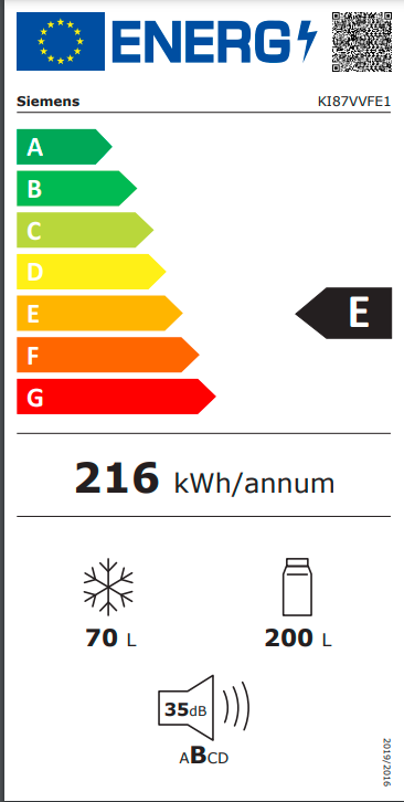 iQ300, Vestavná chladnička s mrazákem dole, 177.2 x 54.1 cm KI87VVFE1 Výkon a spotřeba Třída spotřeby energie: E Čistý celkový objem : 270 l Roční spotřeba energie: 216 kwh Kl ...Více informací