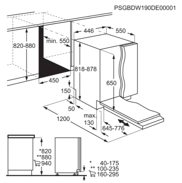 Vestavné rozměry V(min/max)xŠxH (mm): 820/900 x 450 x 550