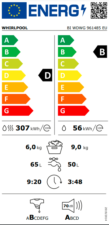 Spotřeba vody pro celý cyklus praní a sušení v litrech na cyklus (EU2017/1369): 65
