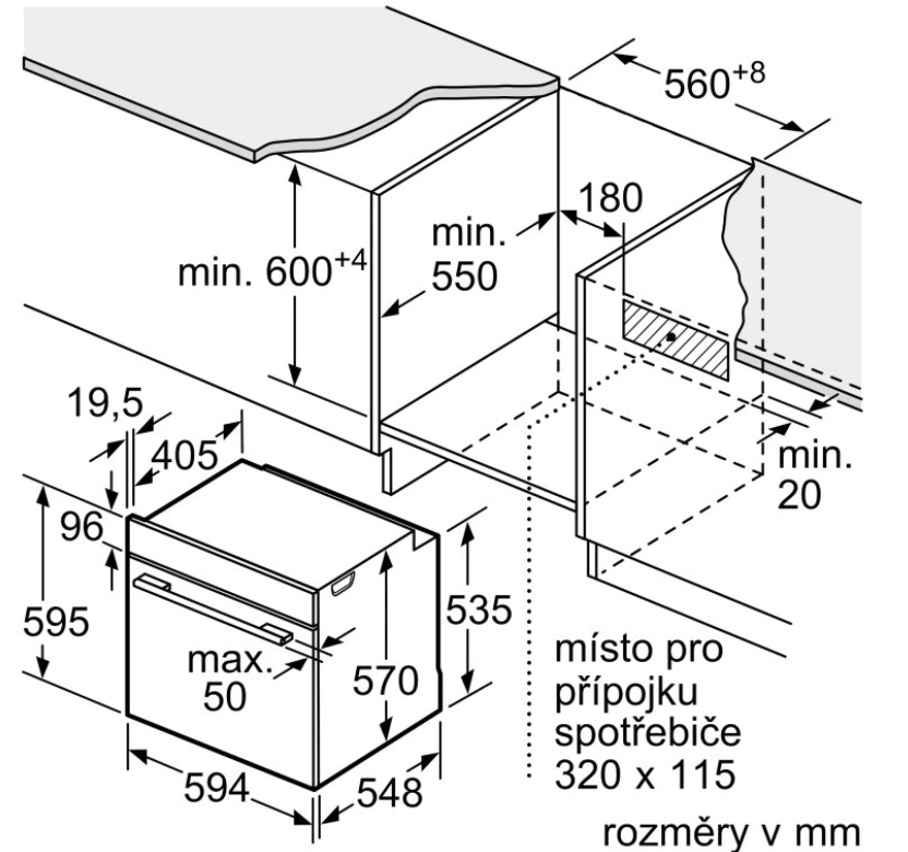 rozměry niky (V x Š x H): 585 mm - 595 mm x 560 mm - 568 mm x 550 mm