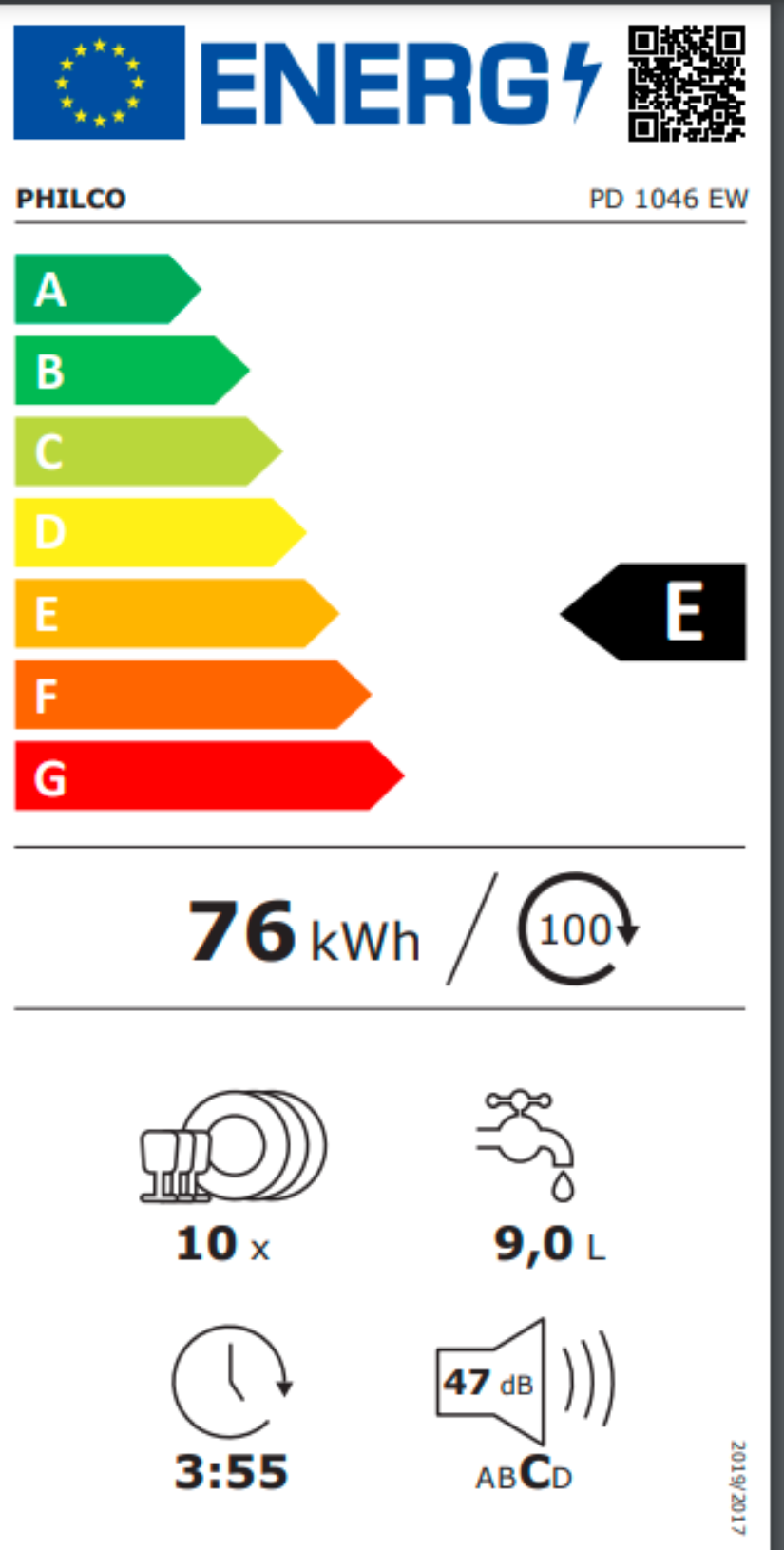 Myčka nádobí Philco PD 1046 EW Parametry Energetická třída E Spotřeba elektriky na 100 cyklů 76 kWh Hlučnost 47db Spotřeba vody 9 l 10 sad nádobí 6 programů 5 teplot Emisní tř ...Více informací